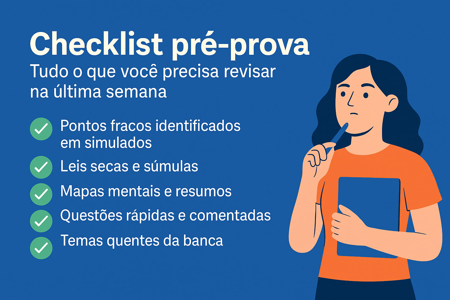 Neste artigo, você terá um checklist completo para organizar a última semana antes da prova, com foco em revisão estratégica, autocuidado e performance máxima no grande dia.